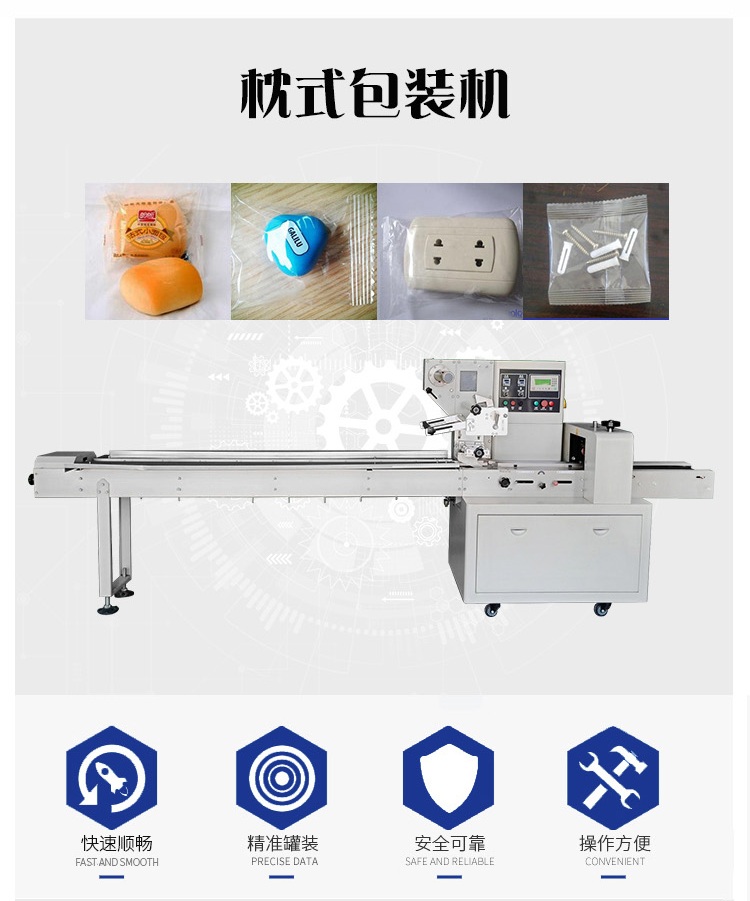 該枕式包裝機(jī)可用于餅干、月餅、蛋黃派、米餅、雪糕、方便面、巧克力等塊狀產(chǎn)品的包裝,特別適合于小批量單一產(chǎn)品的包裝。
